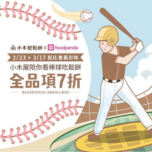 ● 活動內容:於 foodpanda平台訂購小木屋,單筆滿$260即享7折優惠 (最高折抵$80)